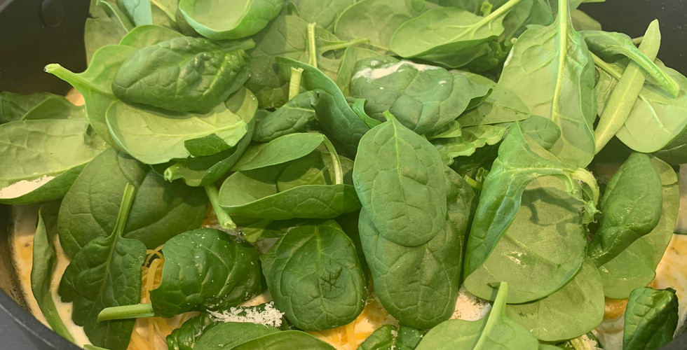 Sofort den Spinat darauf verteilen und sanft in die Flüssigkeit drücken (es macht nichts, wenn nicht alles mit Flüssigkeit bedeckt ist)